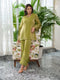 This co-ord set is crafted in luxurious crepe, designed with a contemporary yet graceful silhouette. The top features a curved hemline, highlighted with an artistic leaf motif in applique, beautifully accentuated by intricate golden kadhana embroidery. Playful tassels along the hem add a touch of charm and movement, while the...