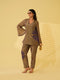 This co-ord set is a chic and elegant ensemble featuring a full-sleeve button-down shirtand matching trousers. The outfit is crafted from a soft, cream-hued fabric, offering arelaxed yet polished look. The shirt is adorned with delicate floral embroidery in a repetitivepattern pink flowers on one set and purple on the other adding a...